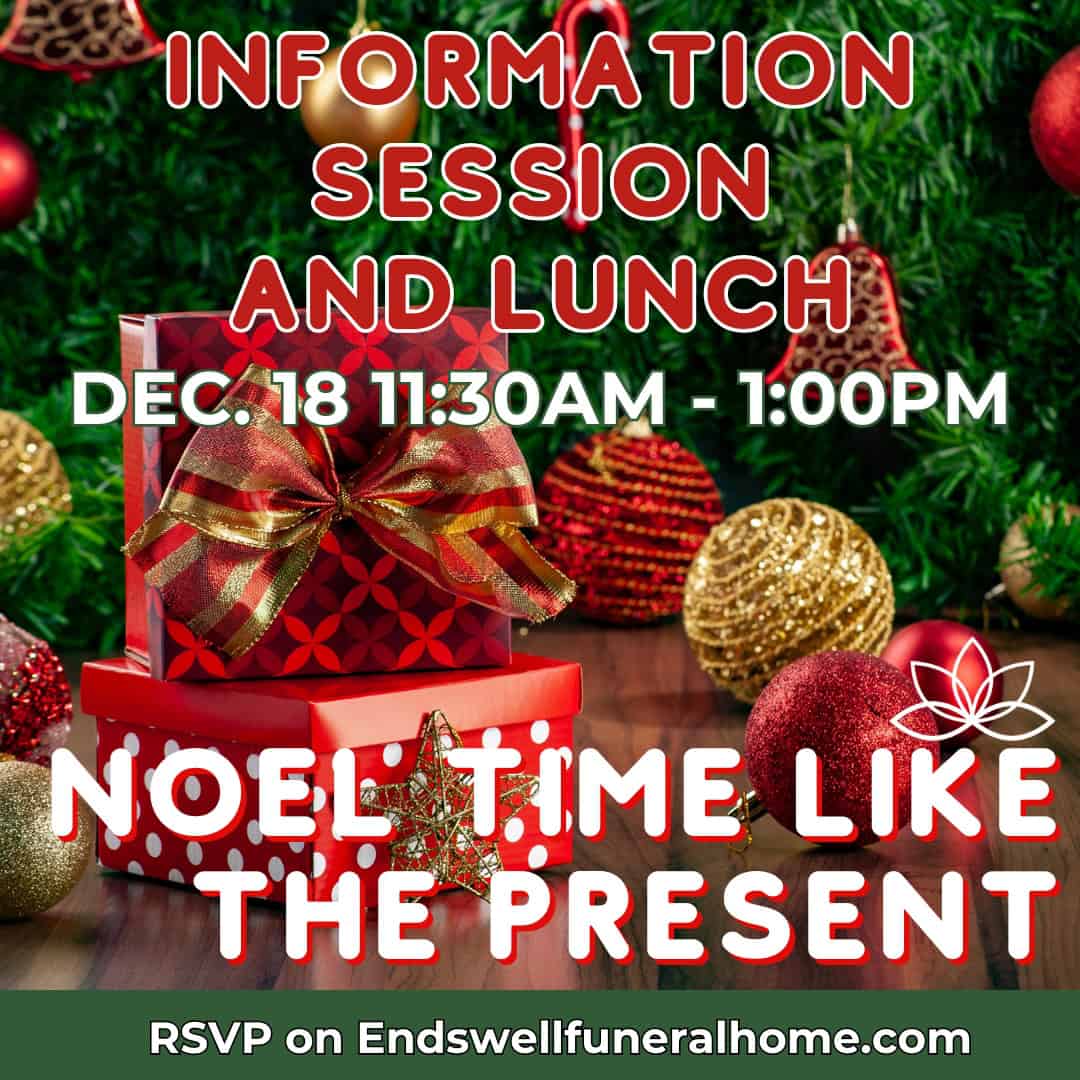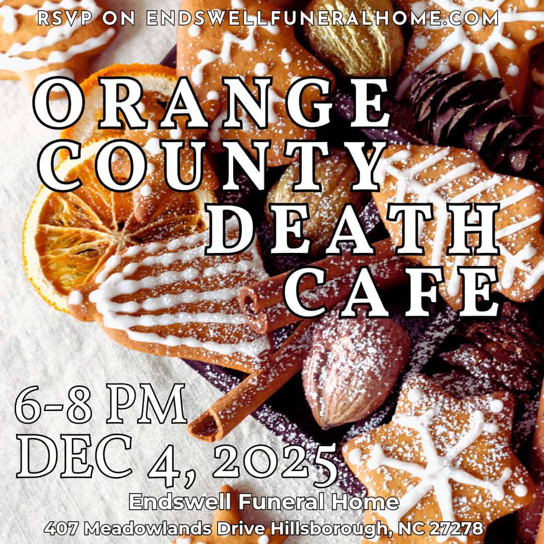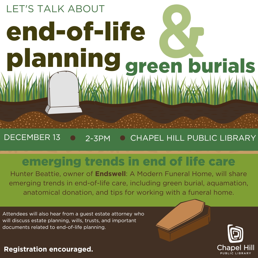 Join Endswell Funeral Home Dec 13 2-3pm at the Chapel Hill Public Library to learn about emerging trends in end-of-life care. Topics will include green burial, aquamation (water cremation), anatomical gift programs, and general tips and tricks when working with a funeral home.